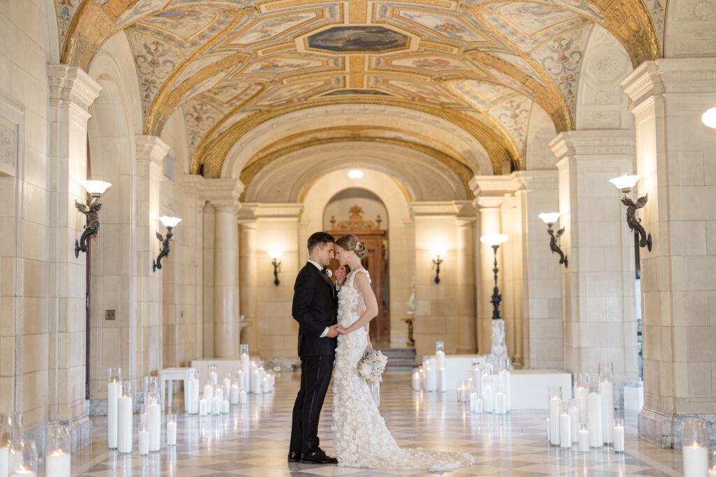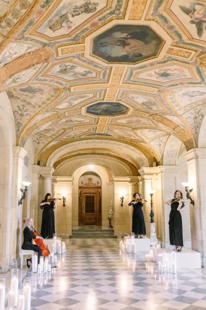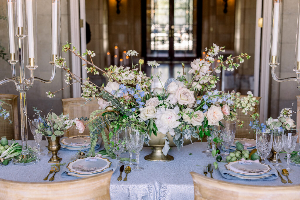 As we designed this editorial, we allowed the mansion itself to lead. The hand painted ceilings in the grand ballroom, the brushwork, the palette, the architectural details all informed our creative direction. Every floral selection, textile choice, and paper element was chosen to feel like a natural extension of the artistry already embedded in the space. Refined. Romantic. Rich in detail.