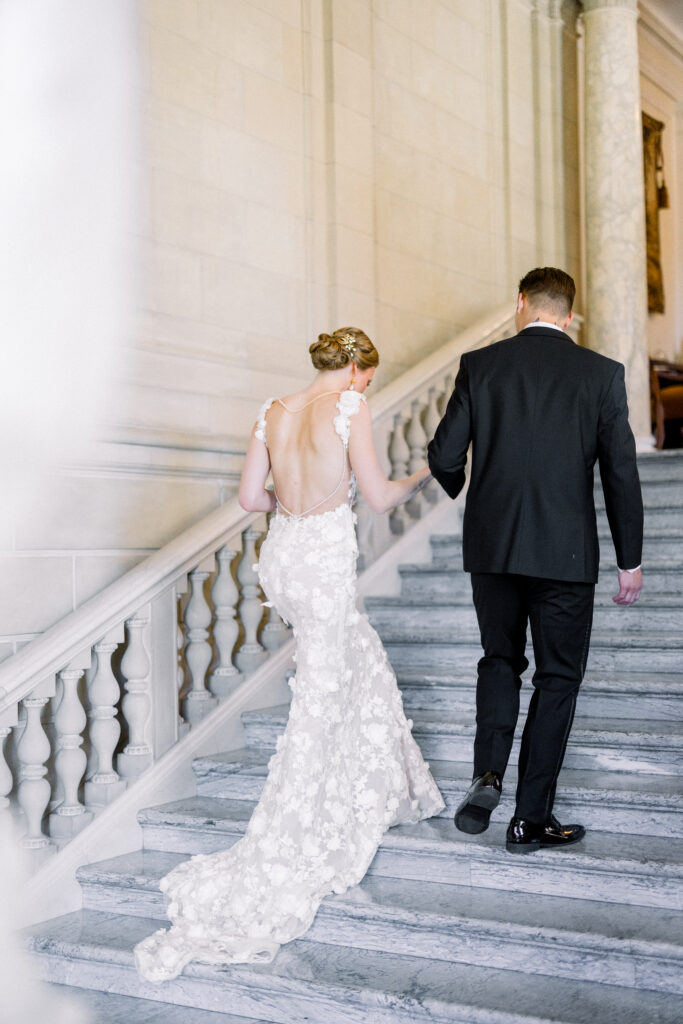 The gowns and menswear were selected for their structure and movement. We cared about how fabric fell on the staircase, how it caught the light beneath the painted ceilings, how it translated in still imagery.